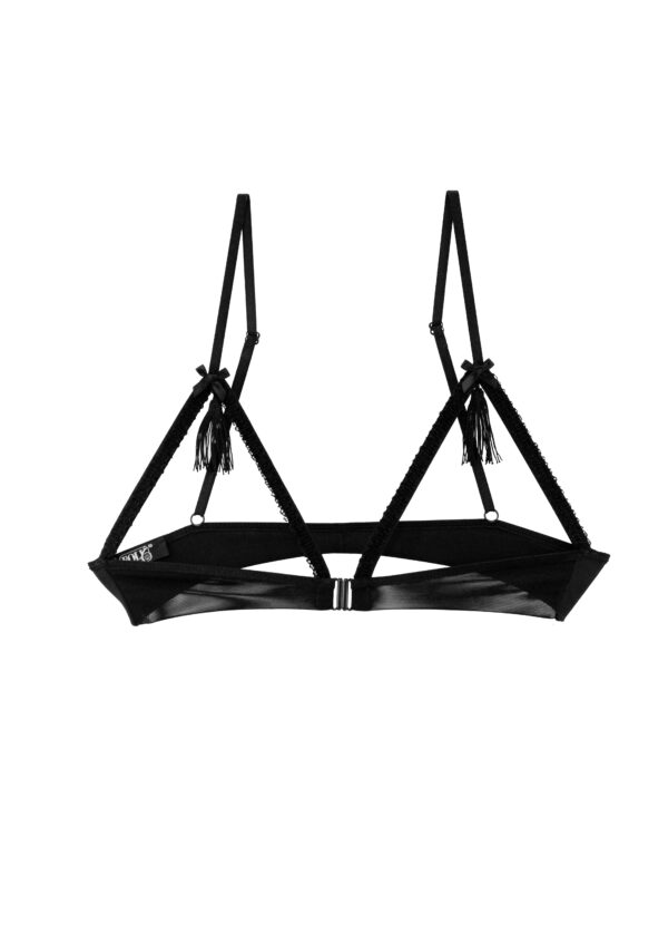 Sensual bra characterized by a black lace and embellished with two bands that wrap the breast.